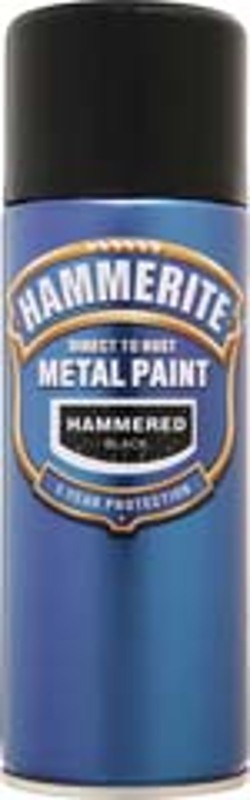 Hammerite Metal Paint can be applied directly onto rusty metal thanks to a formula that has been developed to be a primer, undercoat and topcoat in one. It gives a hammered effect finish which is smooth to touch and sheds water well whilst forming a barrier that not only seals out moisture but gives long lasting protection, both inside and out. Easy to use, apply it on ferrous and non-ferrous metals. Comes in hammered black in a 400ml aerosol can.